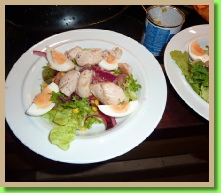Zum Servieren werfen Salat mit Apfelessig und Öl abschmecken. Teilen Sie die Zutaten auf 4-6 Teller, mit dem Brathähnchen und der Knoblauch / Mais Mischung . Fügen Sie die hart gekochten Eiern dazu und garnieren Sie mit Petersilie.