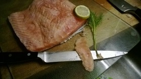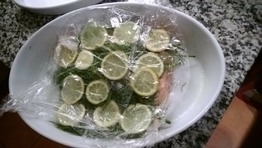 2. Vodka pour this marinade over the fish show little salt and fresh dill shrub and slices of lemon.