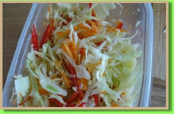 Kohlsalat, Paprika, Möhre und Zwiebel in feine Streifen schneiden mit der Reibe.