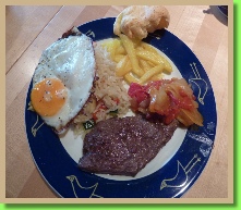 Lomo montado ist ein relativ schnelles Gericht, das wie viele andere die Grundbestandteile bolivianischer Küche variiert: Rindfleisch, Ei, Zwiebeln, Reis, Kartoffeln.