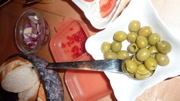 Zwiebeln in feinen Scheiben schneiden und in Sherryessig legen. Dazu Oliven geben.