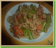 Rohe Kartoffen oder Nudeln(wie ich es gemacht habe), die geschnittenen Karotten und Bohnen zusammen in einen Topf mit Wasser bedecken und 2 TL Salz hinzufügen. Zum Kochen bringen und rund 10-20 Minuten köcheln lassen bis das Gemüse gar ist, Abgießen und beisete stellen.