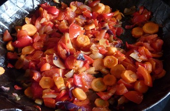 Fry the carrots in a pan for a few minutes then add the onion, chillies and bell pepper. Fry for five minutes more then add the tomatoes. Cook until the tomatoes break down and form a mush. Season and serve with rice or Pap