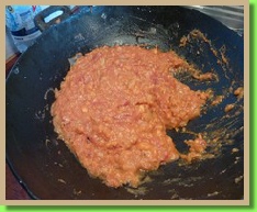 Im Wok die Tomaten hinzufügen und aufkochen lassen. Dann das Maismehl in kaltes Wasser schnell reinrühren und den Tomaten zufügen.